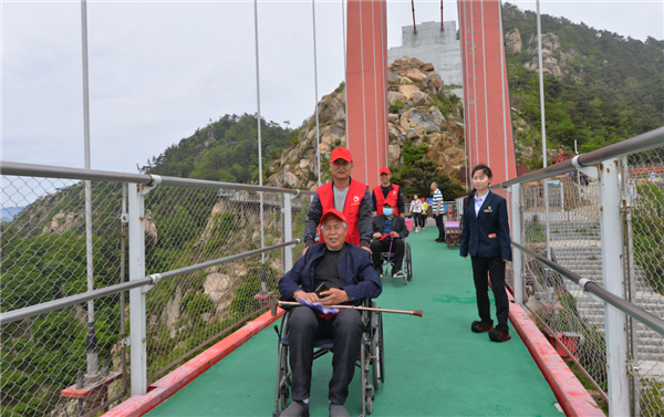在費縣天蒙山景區,黨員志愿者陪同殘疾人朋友乘坐索道、途經無障礙游步道到達了海拔近千米的世界第一人行玻璃懸索橋,和其他游客一同登山賞景,幫助他們實現無障礙旅游的夙愿。隨后,在《沂蒙山小調》誕生地,大家參觀展館,唱響沂蒙紅歌,追憶崢嶸往昔,緬懷革命先烈,開展了一堂生動的黨史教育課。