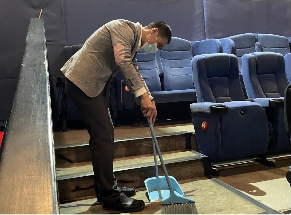 集團黨委委員、副總經理、機關黨委書記孫超和一支部的成員一道,通過為顧客制作爆米花和飲品、對影廳進行消毒和衛生清理,體驗了影城經營一線的日常服務項目。