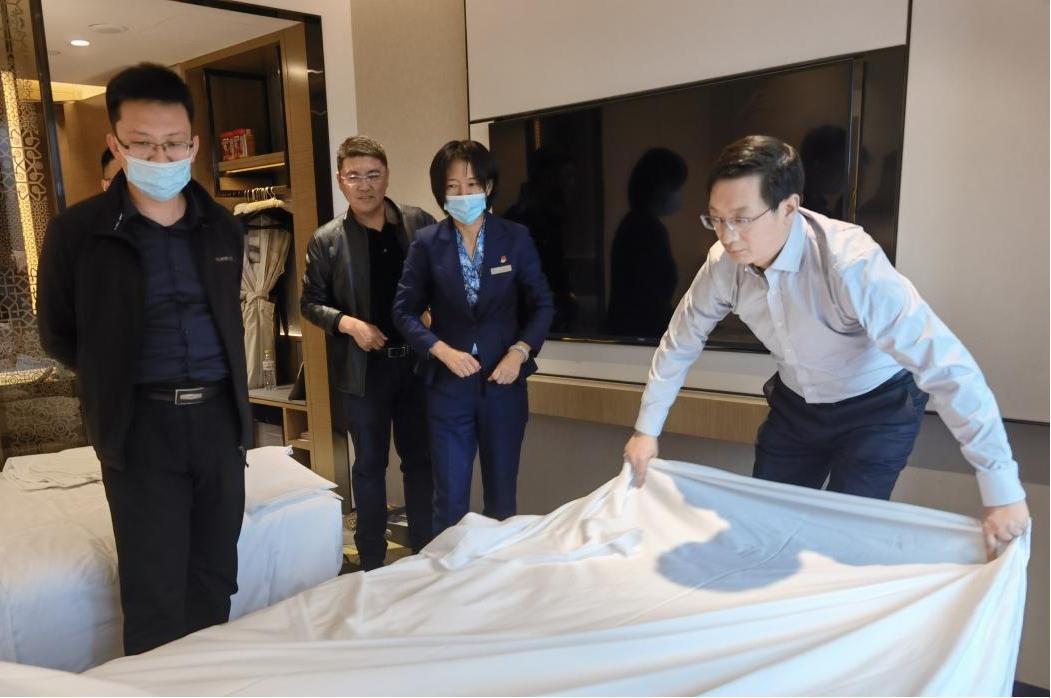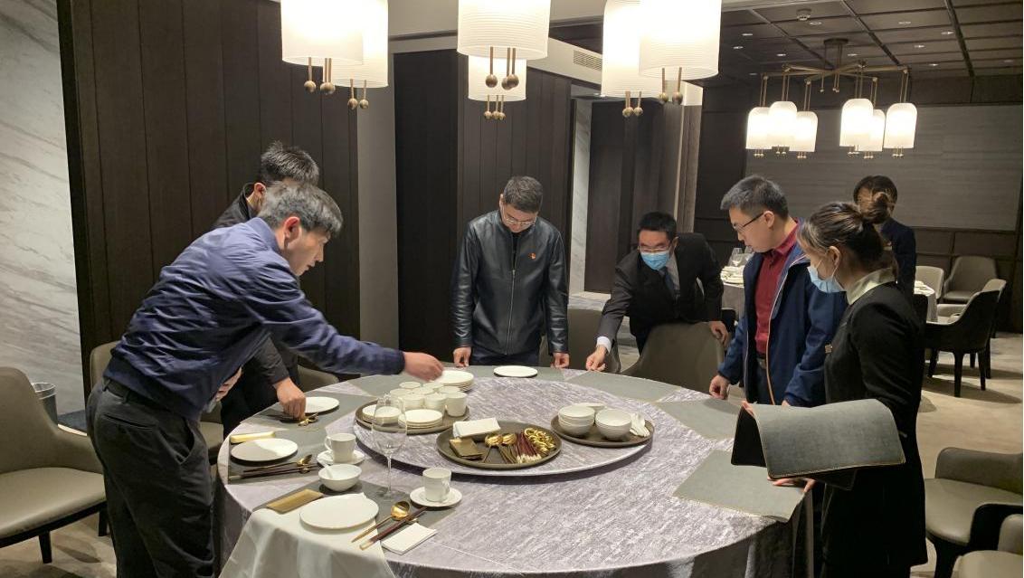 二支部在泉城大酒店參觀酒店實施5S精細化管理的工作場景,詳細了解廚房、客房、設備間、員工餐廳等不同崗位的工作流程,經過簡短的崗前培訓,支部成員分別到客房、餐廳參加打掃客房、餐具擺臺等服務項目。