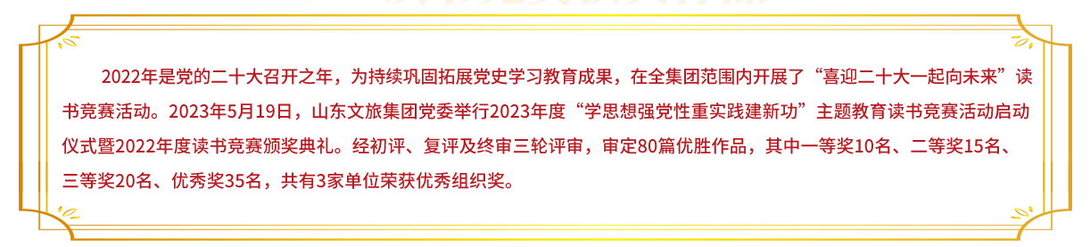 2023年是學習貫徹黨的二十大精神的開局之年,是實施“十四五”規劃承上啟下之年,為深入學習宣傳貫徹黨的二十大精神,扎實開展學習貫徹習近平新時代中國特色社會主義思想主題教育,在集團形成愛讀書、讀好書、善讀書的濃厚氛圍,堅持“規模效益年”年度工作方針,不斷加強企業文化和黨建工作,助推集團高質量發展,今年在全集團范圍內開展“學思想 強黨性 重實踐 建新功”主題教育讀書競賽活動。