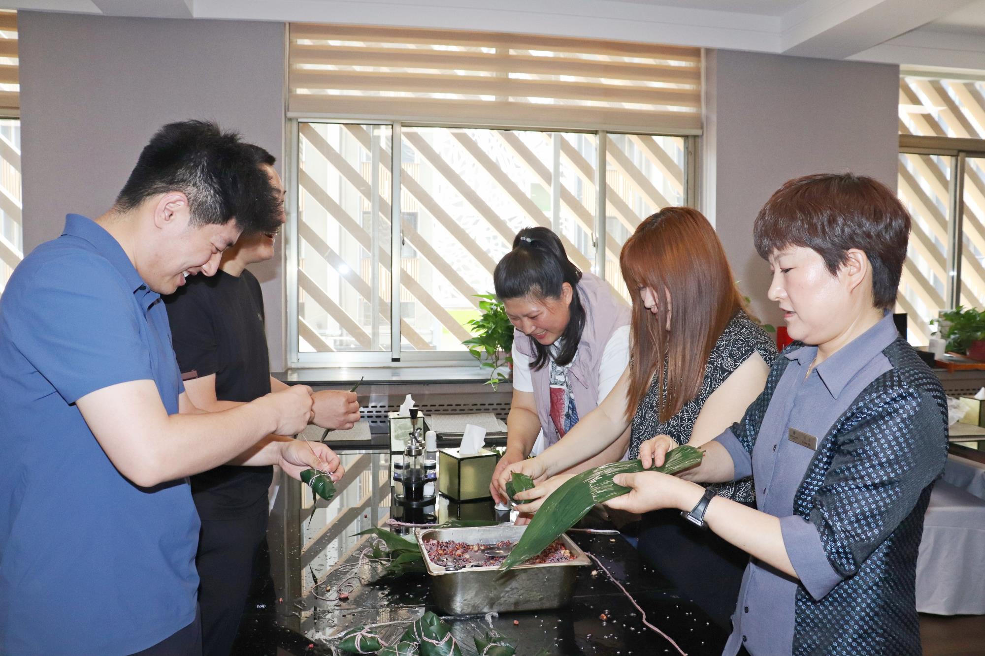 活動中,山東文旅酒店集團大廚耐心為大家傳授包粽子的技巧。從挑選粽葉、填糯米、放餡料,到包裹、捆扎,每一個步驟都細致演示。大家團聚在一起,一邊學習,一邊動手實踐。不一會兒,一個個棱角分明的粽子便整齊排列,大家互相交流、互相幫助,歡聲笑語不斷。