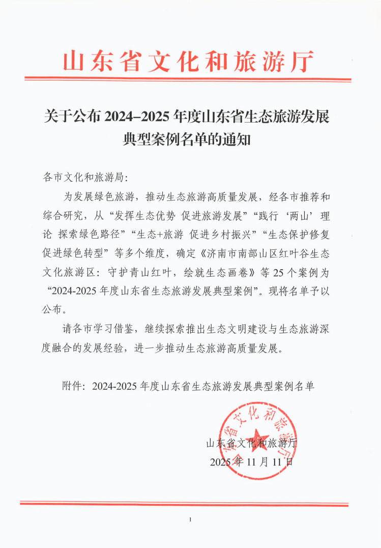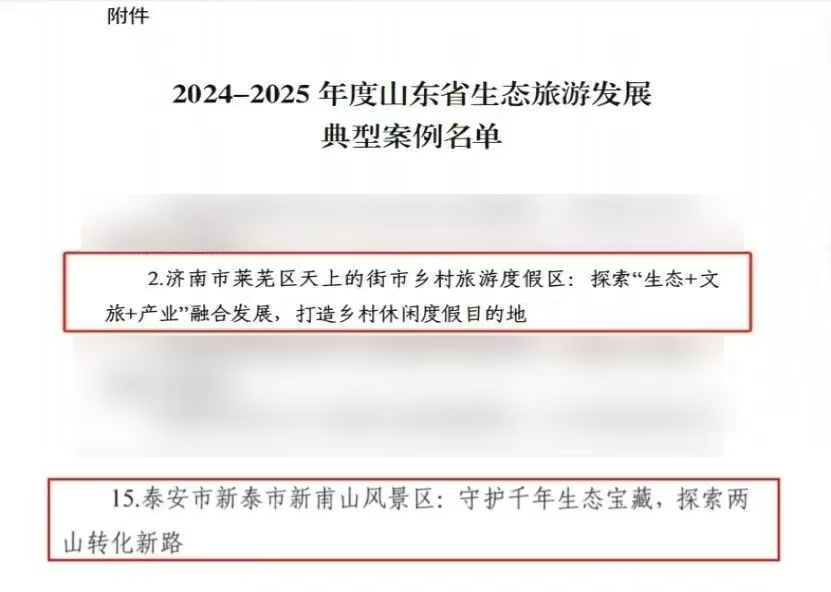 近日,“生態山東 綠色休閑”2025山東生態旅游推進活動在濟南市萊蕪區成功舉辦。在活動現場,省文化和旅游廳公布了2024-2025年度山東省生態旅游發展典型案例名單,山東文旅集團濟南天上的街市鄉村旅游度假區和新泰新甫山景區兩項目入選。