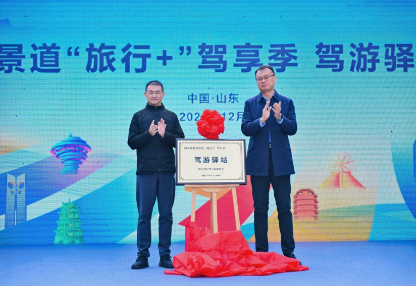 啟動儀式現場,山東省自駕車旅游協會副會長王維、山東文旅·紅葉柿巖旅游區總經理李鵬為山東旅游風景道“旅行+”駕游驛站正式揭牌。