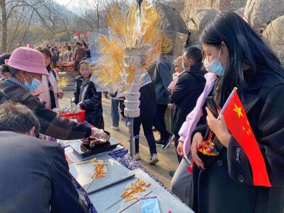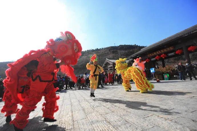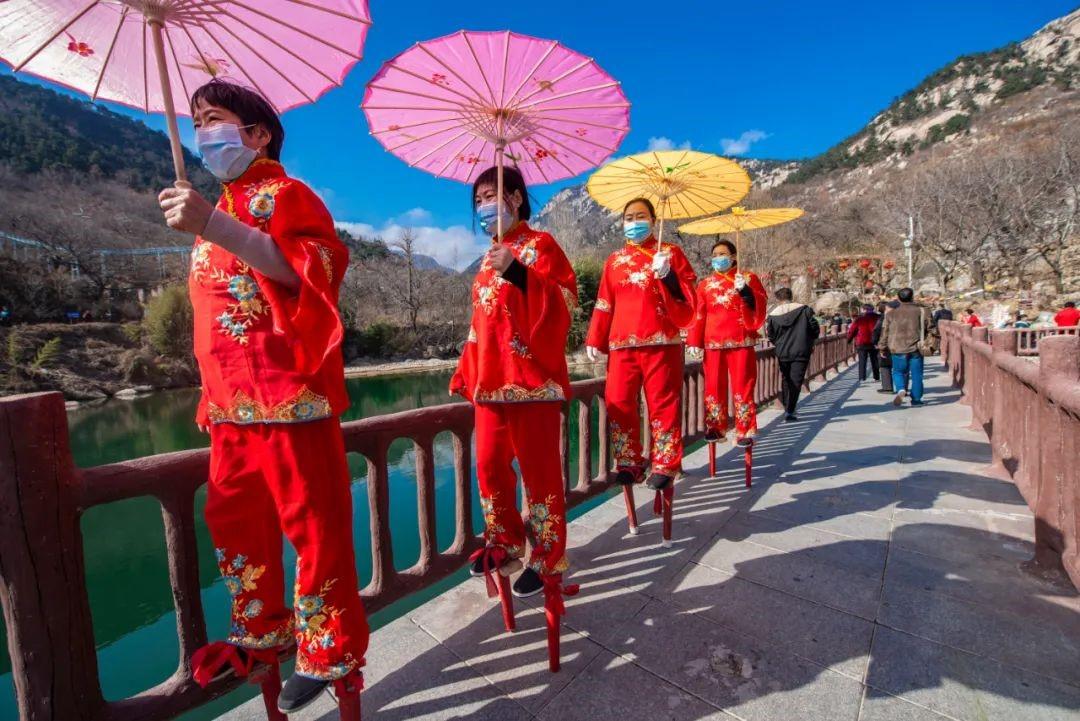大年初一至初五,天蒙山景區每天進行熱鬧的舞龍舞獅、踩高蹺、扭秧歌、山羊馬戲等民俗巡游表演,游客和沂蒙老鄉現場互動,攤煎餅、編柳編、剪紙,玩的不亦樂乎。