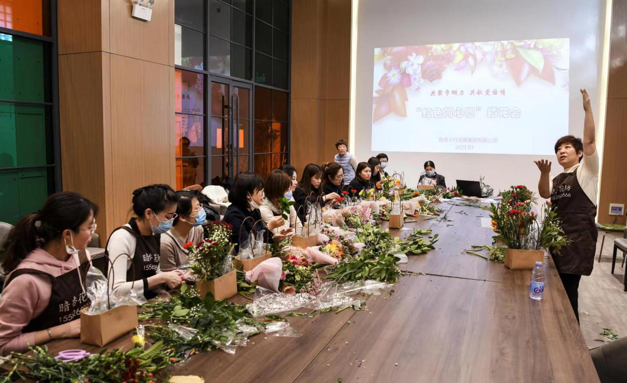 3月3日,為加強政企共建,發揮國有企業在社區治理中的社會責任,在“三八”國際婦女節來臨之際,魯商鄉村發展集團(簡稱“鄉發展集團”)聯合雙報到單位——山師東路社區黨委共同開展“共聚巾幗力 共獻愛國情 紅色同心圓”插花活動。