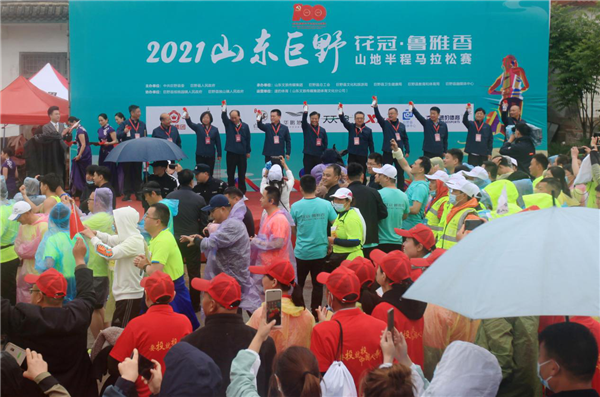 五月金山風景好,運動健身正當時。5月16日上午8點,由中共巨野縣委、縣政府主辦,山東文旅傳媒集團、巨野縣總工會、文化和旅游局、教育和體育局、衛生健康局、融媒體中心承辦,巨野縣核桃園鎮政府、獨山鎮政府協辦,山東文旅傳媒集團速豹體育運營的2021山東巨野山地半程馬拉松賽在蒙蒙細雨中激情開跑,山東文旅傳媒集團黨委書記、董事長龐道鋒與巨野縣委書記王昌華、縣長王東共同為賽事“鳴笛”。