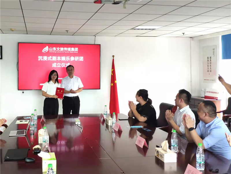 論壇現場,山東文旅傳媒集團沉浸式劇本娛樂參研團舉行了成立儀式,龐道鋒為參研團團長寇建偉頒發了聘書。參研團吸收對劇本殺體驗有興趣、對行業發展有想法、對未來業務拓展有規劃的員工為團員,將不定期組織團員參與劇本殺體驗,并以此為平臺進行劇本殺相關業務的探索。