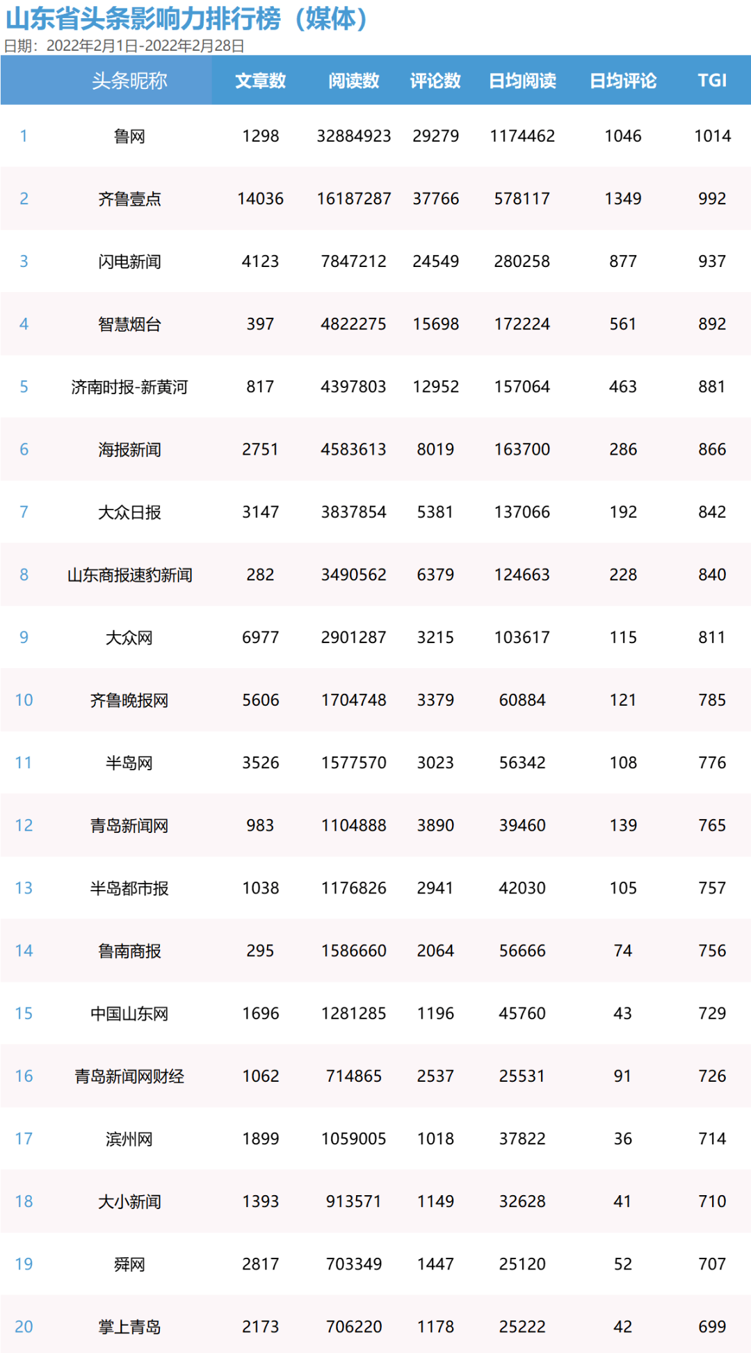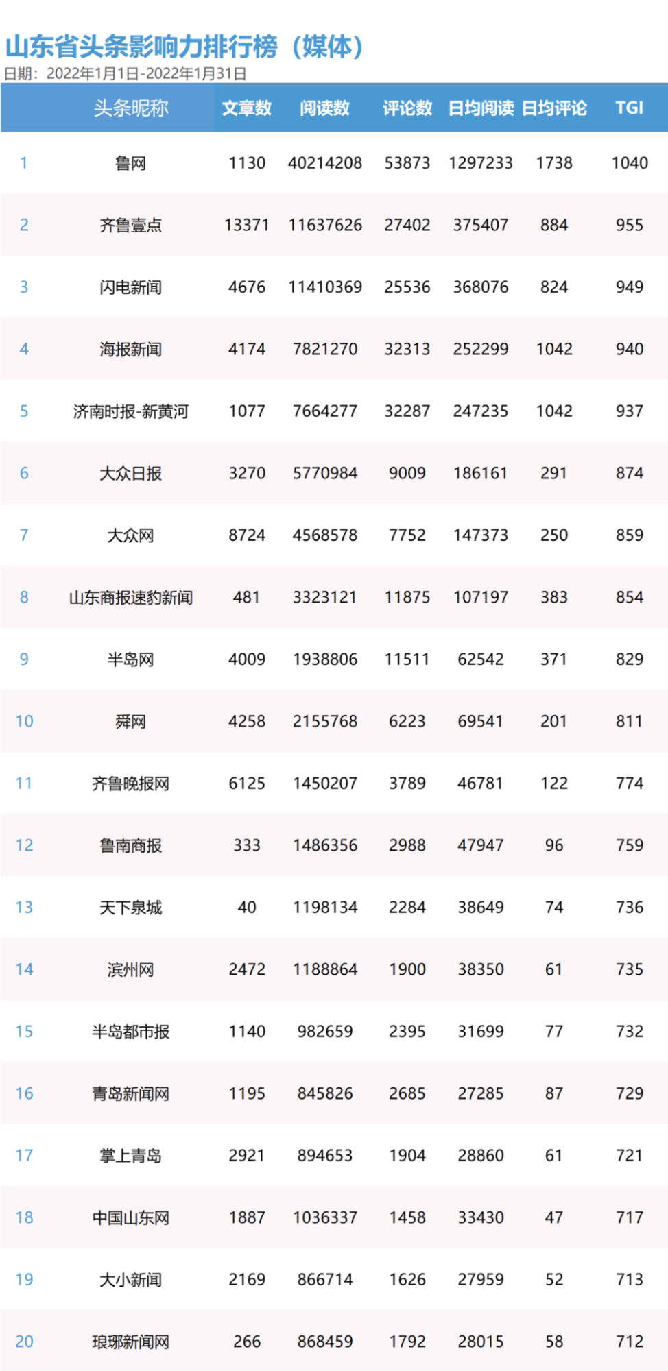 在此前發布的1月份山東省頭條影響力排行榜(媒體)中,“魯網”均篇傳播效果最佳,篇均閱讀量突破3萬,共獲得4021萬閱讀量、129萬日均閱讀量和5萬評論數,超過榜單中其他媒體賬號,以1040的TGI值位列第一。
