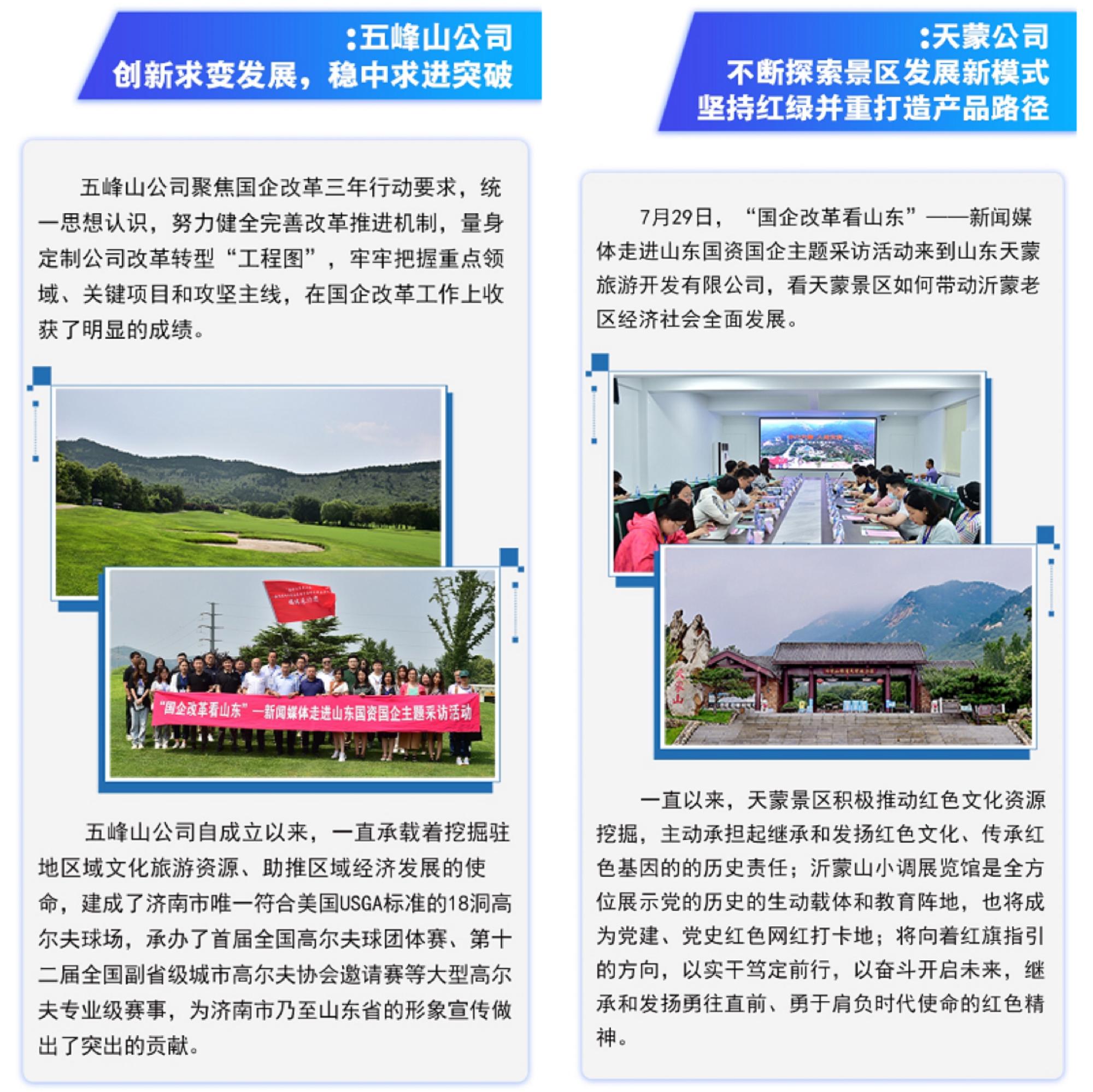 從集團總部到各產業板塊、各項目,人民日報、新華社等20余家媒體深入到六大采訪點,記錄山東文旅人爭當時代先行者的鏗鏘步伐,重點挖掘在推動企業重組整合、深化三項制度改革、心無旁騖攻主業、強化科技創新能力等方面的生動實踐,全方位、多角度展示山東文旅集團推進國企改革最新成果和典型經驗,營造國企改革良好輿論氛圍。