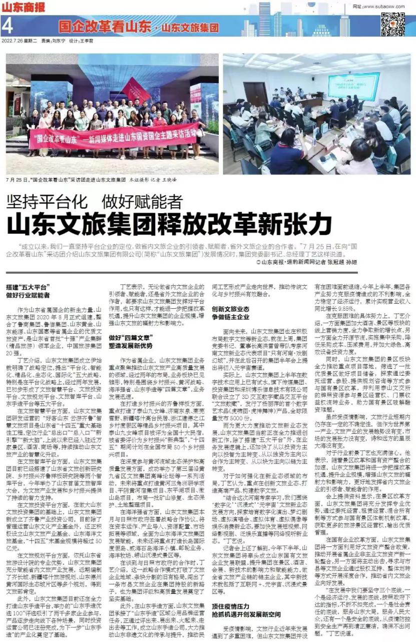 山東文旅集團明確“54331”的發展思路,提出平臺化、智能化、精品化、生態化、國際化“五大戰略”,打造平臺企業。丁藝表示,無論做省內文旅企業的引領者、賦能者,還是省外文旅企業的合作者,都要求山東文旅集團發揮好平臺作用,也只有這樣,才能進一步把握改革機遇,提升山東文旅集團的企業規模,增強山東文旅的輻射力和影響力。