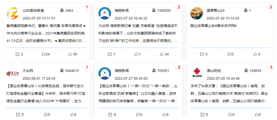 聚焦山東國企改革,包括人民日報、新華社、光明日報、經濟日報、中國日報、科技日報、中國證券報·中證網、中國經濟周刊、工人日報、中國青年報、中國發展改革報、中國旅游報、人民網、新華網、中國網、光明網、大眾日報客戶端、大眾網·海報新聞、齊魯網·閃電新聞、新浪、搜狐、今日頭條、抖音等央級、省級重點新聞媒體、商業網站、客戶端以及社交平臺的高度關注,多家主流媒體通過文字+圖片、文字+音視頻等報道形式,對活動進行全方位、立體式、多樣化報道,收到良好傳播效果。