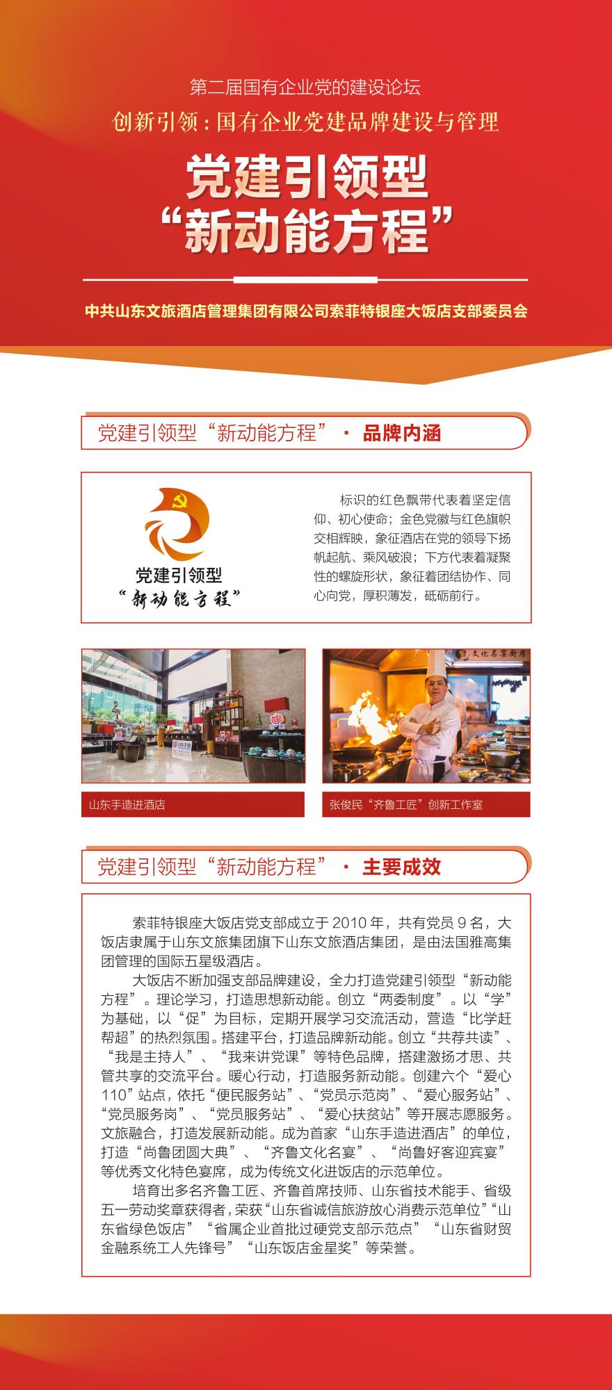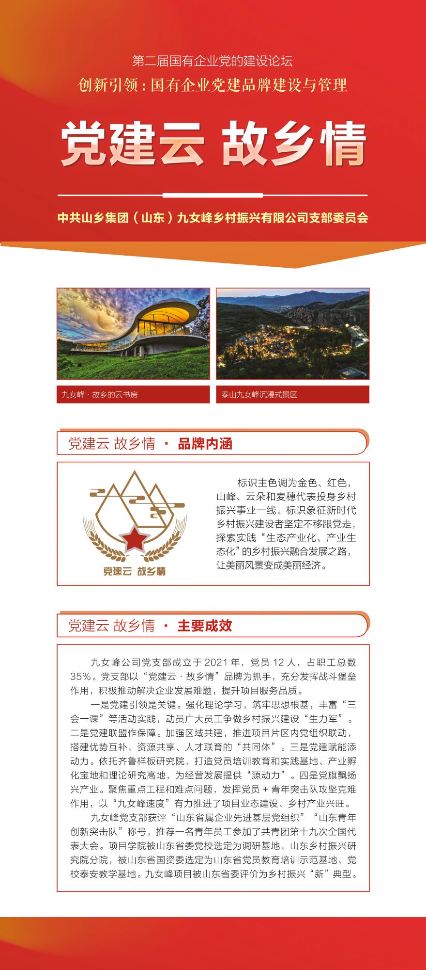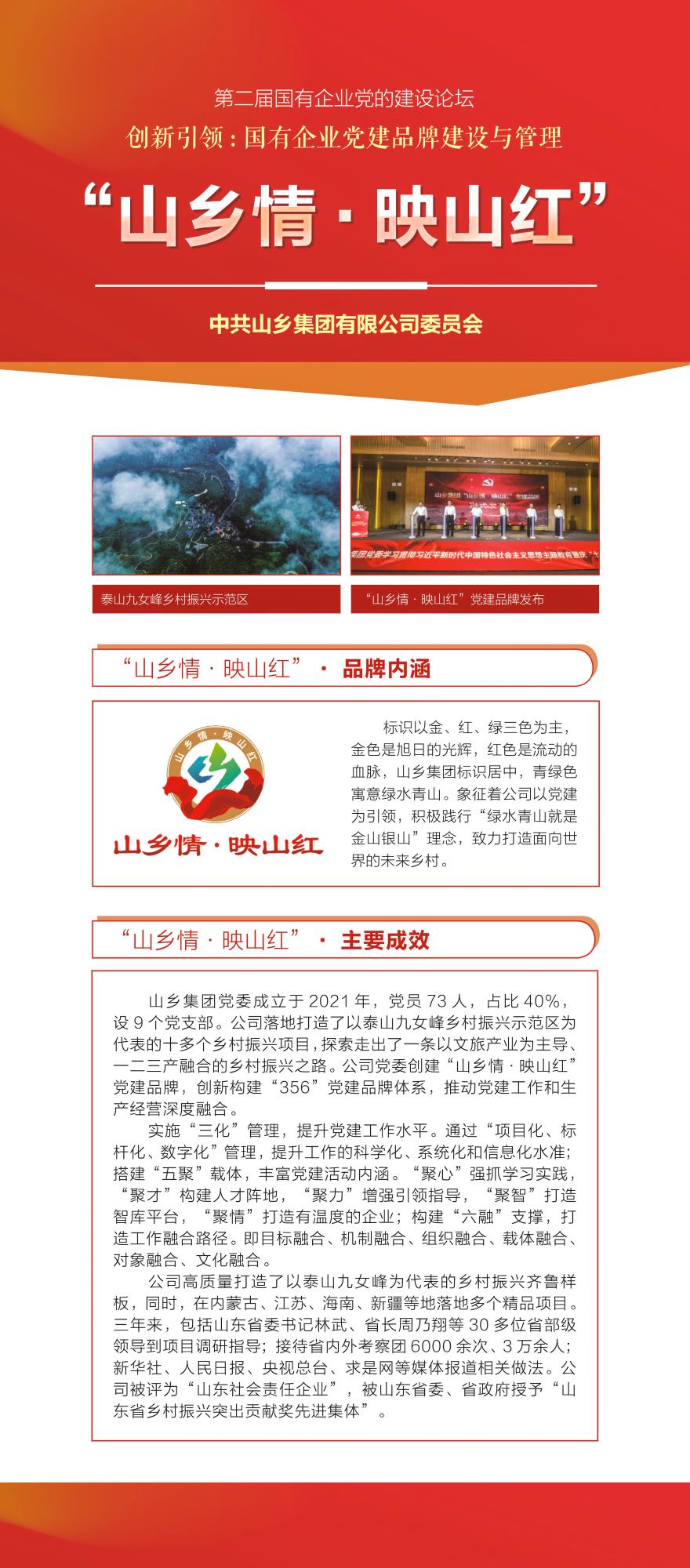 10月19日至20日,由中國企業改革與發展研究會和《國企》雜志主辦、山東省管企業黨建與思想政治工作研究會承辦的第二屆國有企業黨的建設論壇在山東濟南舉辦。本次論壇以《創新引領:國有企業黨建品牌建設與管理》為主題。論壇上,山鄉集團黨委就“山鄉情·映山紅”黨建品牌作典型發言,“山鄉情·映山紅”、索菲特黨支部黨建引領型“新動能方程”、九女峰公司黨支部“黨建云·故鄉情”三個黨建品牌在論壇上獲得展示。文旅景區黨委“擦亮‘沂蒙紅’黨建品牌 引領山岳型景區創新發展”、山鄉集團黨委“山鄉情·映山紅”榮獲國企黨建品牌建設優秀案例。