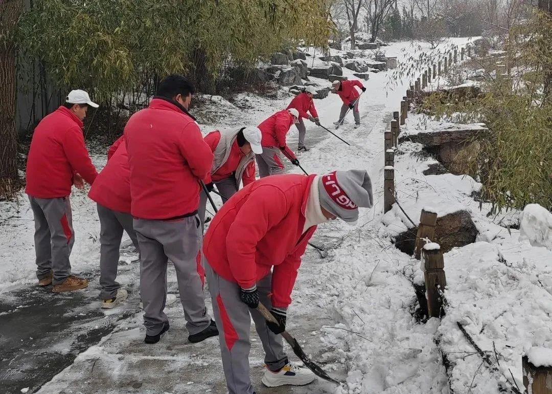活動中,黨員干部帶頭沖鋒在前,大家推著雪鏟、揚著鐵鍬、揮舞著掃把,不懼嚴寒、分工明確、干勁十足,進行了一場酣暢淋漓的浴“雪”奮戰!在大家共同的努力下,公司全域主干道、人行區、停車場、球道積雪被及時清理,為一線經營掃除障礙,為出入安全保駕護航;用心用情為業主以及員工宿舍房前屋后掃除積雪,用實際行動闡述“讓員工和客戶因我們的存在而自豪”的企業文化。