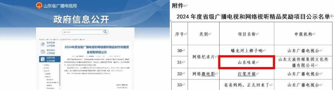 近日,山東省廣播電視局組織開展2024年度省級廣播電視和網絡視聽精品創作傳播資金獎勵項目的申報、評選工作。由山東省商務廳、山東文旅集團出品,山東文旅傳媒集團、山東文旅傳媒集團文化傳播有限公司、山東映訊文化傳播有限公司聯合出品的山東風味系列美食紀錄片《山東味道》在眾多申報項目中脫穎而出,入選2024年度省級廣播電視和網絡視聽精品創作傳播資金獎勵項目。