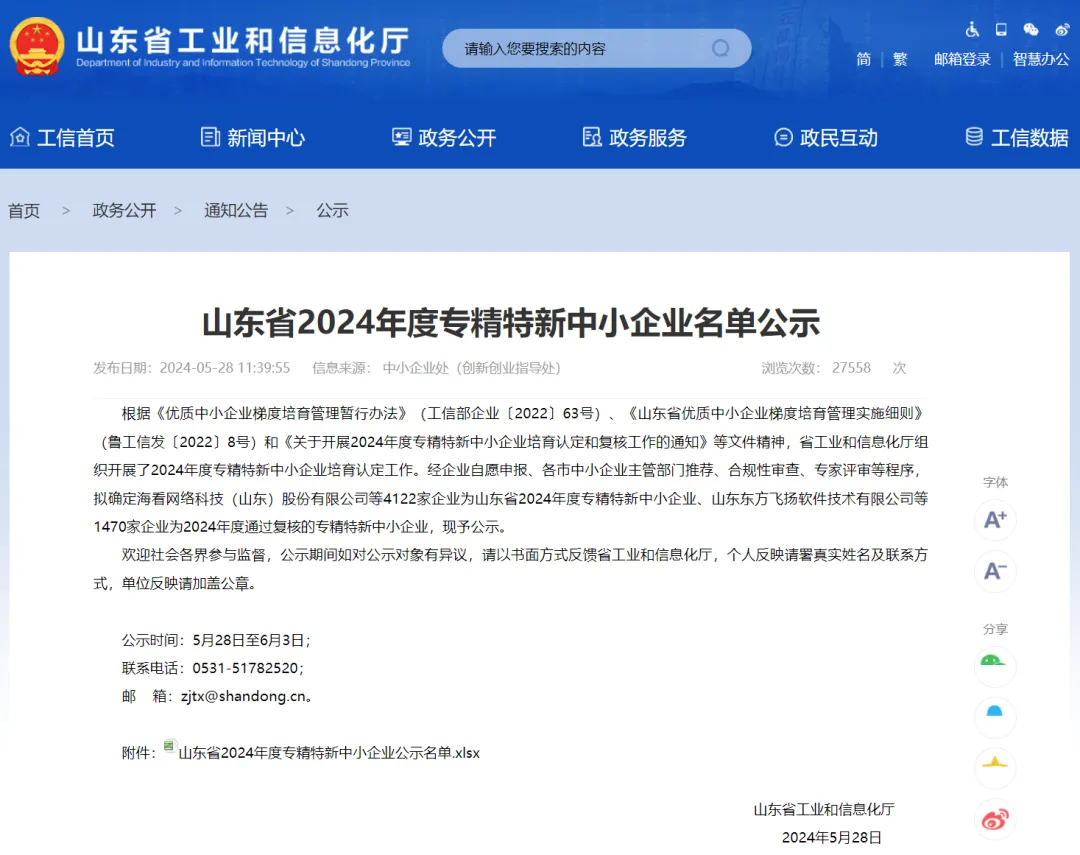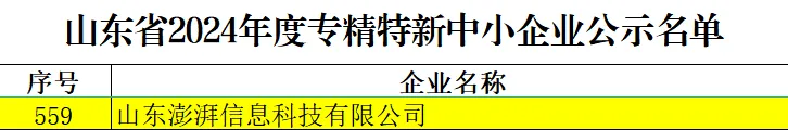 近日,山東省工業(yè)和信息化廳發(fā)布了《山東省2024年度專精特新中小企業(yè)名單公示》,山東文旅集團科技發(fā)展有限公司權屬單位山東澎湃信息科技有限公司(簡稱“澎湃科技”)成功入選山東省2024年度專精特新中小企業(yè),這是澎湃科技繼通過高新技術企業(yè)認定之后又一殊榮。