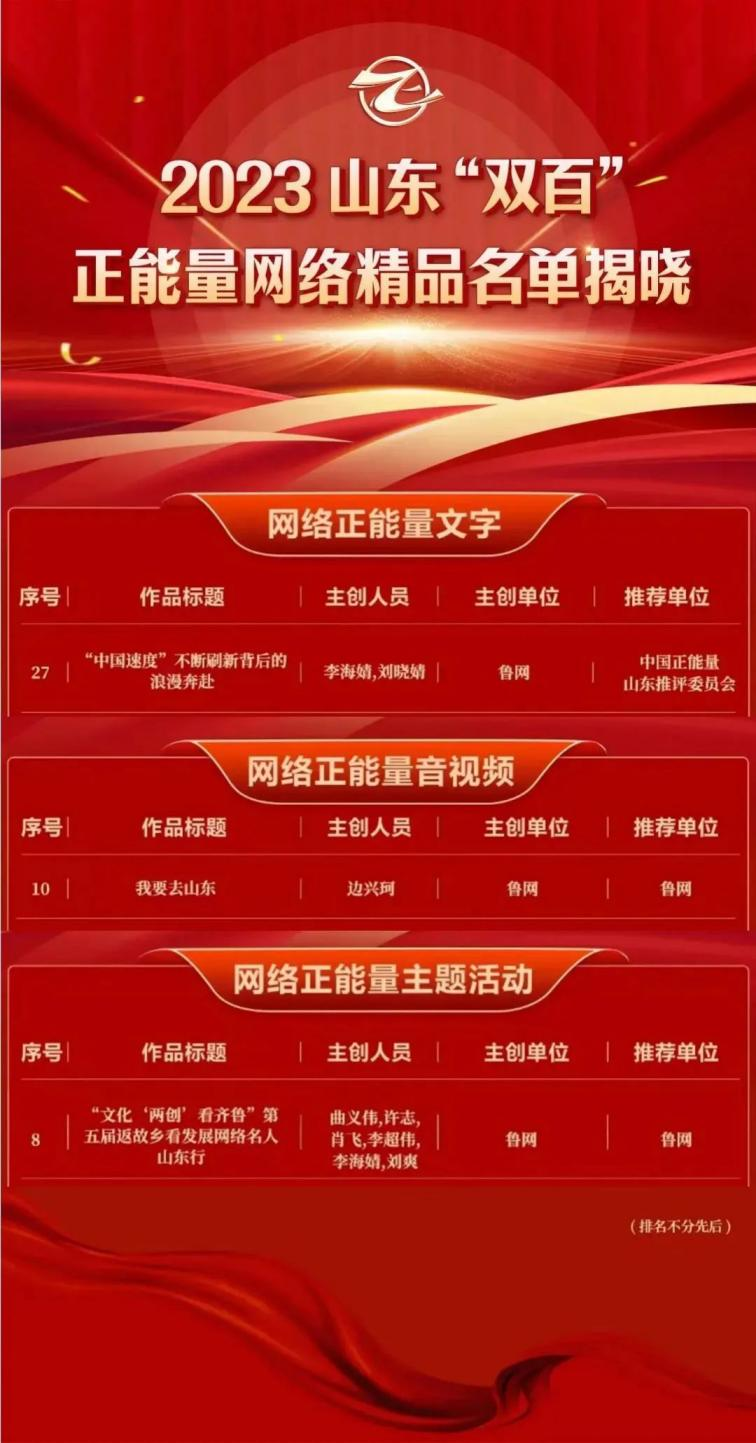 由山東省委網(wǎng)信辦主辦的2023山東“雙百”正能量網(wǎng)絡(luò)精品評選中,魯網(wǎng)作品《“中國速度”不斷刷新背后的浪漫奔赴》《我要去山東》《“文化‘兩創(chuàng)’看齊魯”第五屆返故鄉(xiāng)看發(fā)展網(wǎng)絡(luò)名人山東行》分獲網(wǎng)絡(luò)正能量文字、網(wǎng)絡(luò)正能量音視頻與網(wǎng)絡(luò)正能量主題活動獎項(xiàng)。
