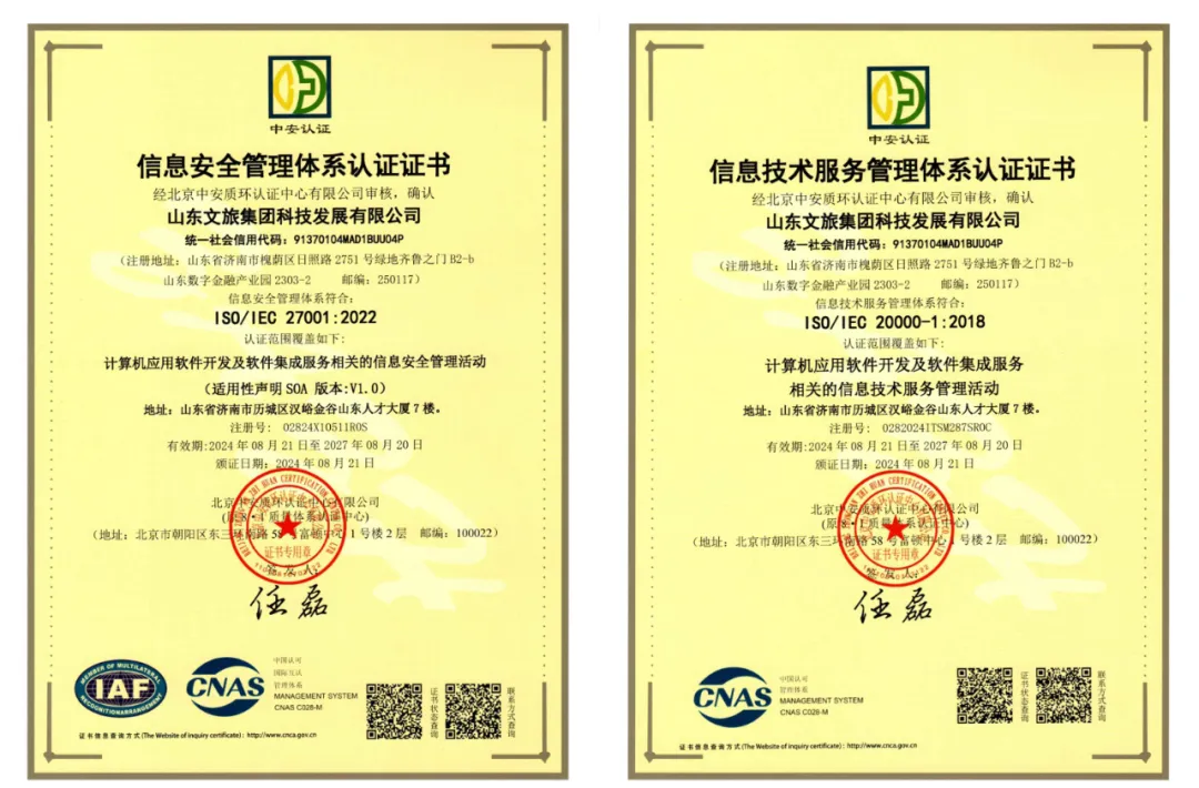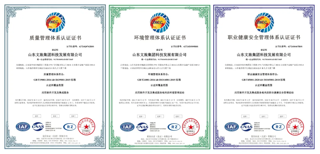 近期,為推進業務規范化管理,提升公司市場拓展能力,文旅科技公司通過了由國際標準化組織(ISO)制定的五項管理體系認證。其中包括,作為企業管理現代化重要標志的ISO9001質量管理體系、ISO14001環境管理體系、ISO45001職業健康安全管理體系等三項體系,以及信息軟件開發行業必備的ISO20000信息技術服務管理體系認證、ISO27001信息安全管理體系認證等兩項體系。