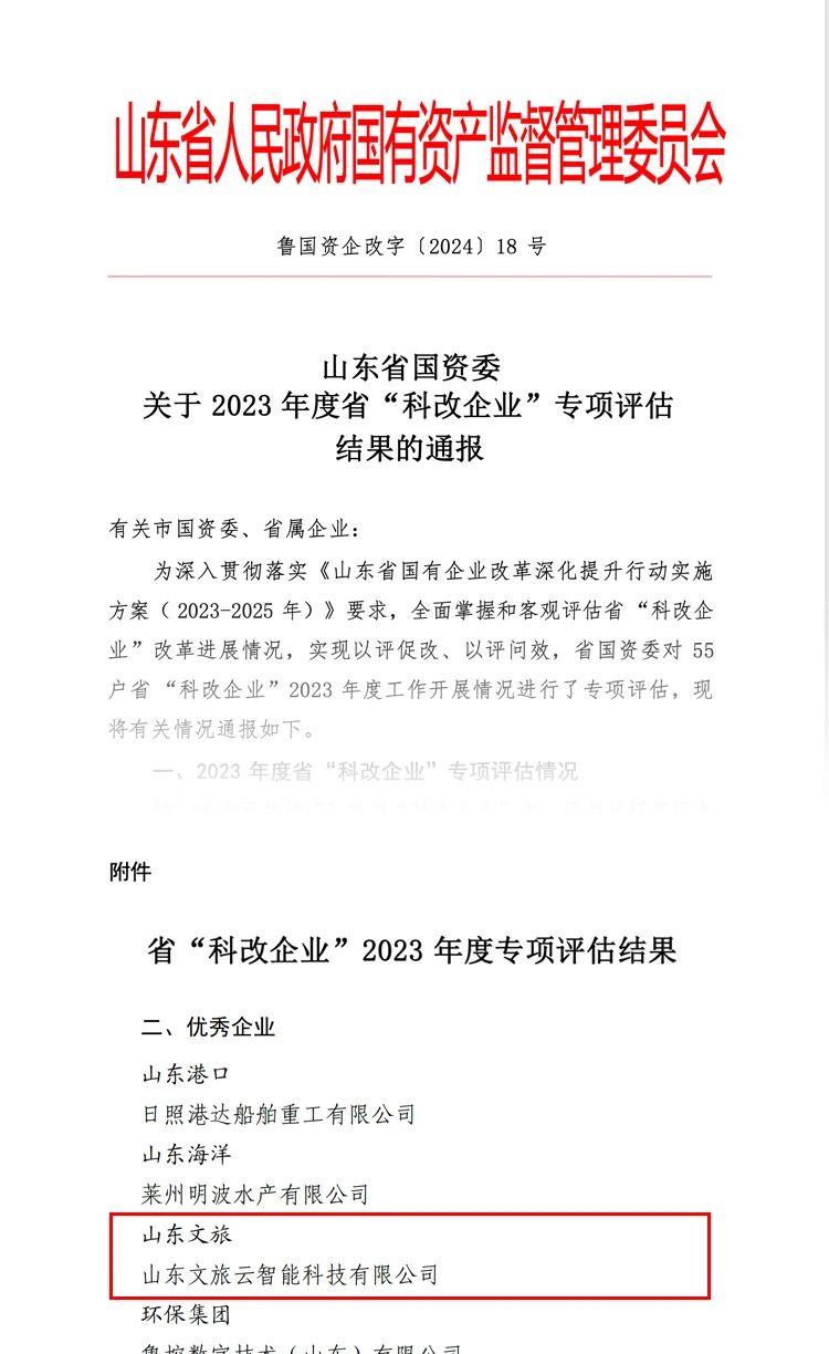 近日,山東省國資委公布2023年度省“科改企業”專項評估結果,文旅云公司被評為“優秀企業”。