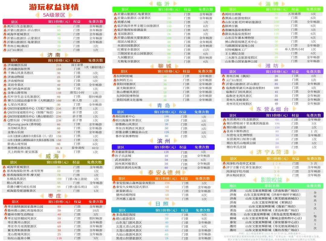 “好客山東一碼通”惠民文旅年卡加盟景區總數突破110家,產品覆蓋山東全省7家5A級景區、50余家4A級景區,更有高爾夫球場、溫泉度假村、滑雪場、親子樂園、豪華影院等眾多高端休閑娛樂資源,總價值超萬元,全方位滿足游客多元化、高品質的出游需求。