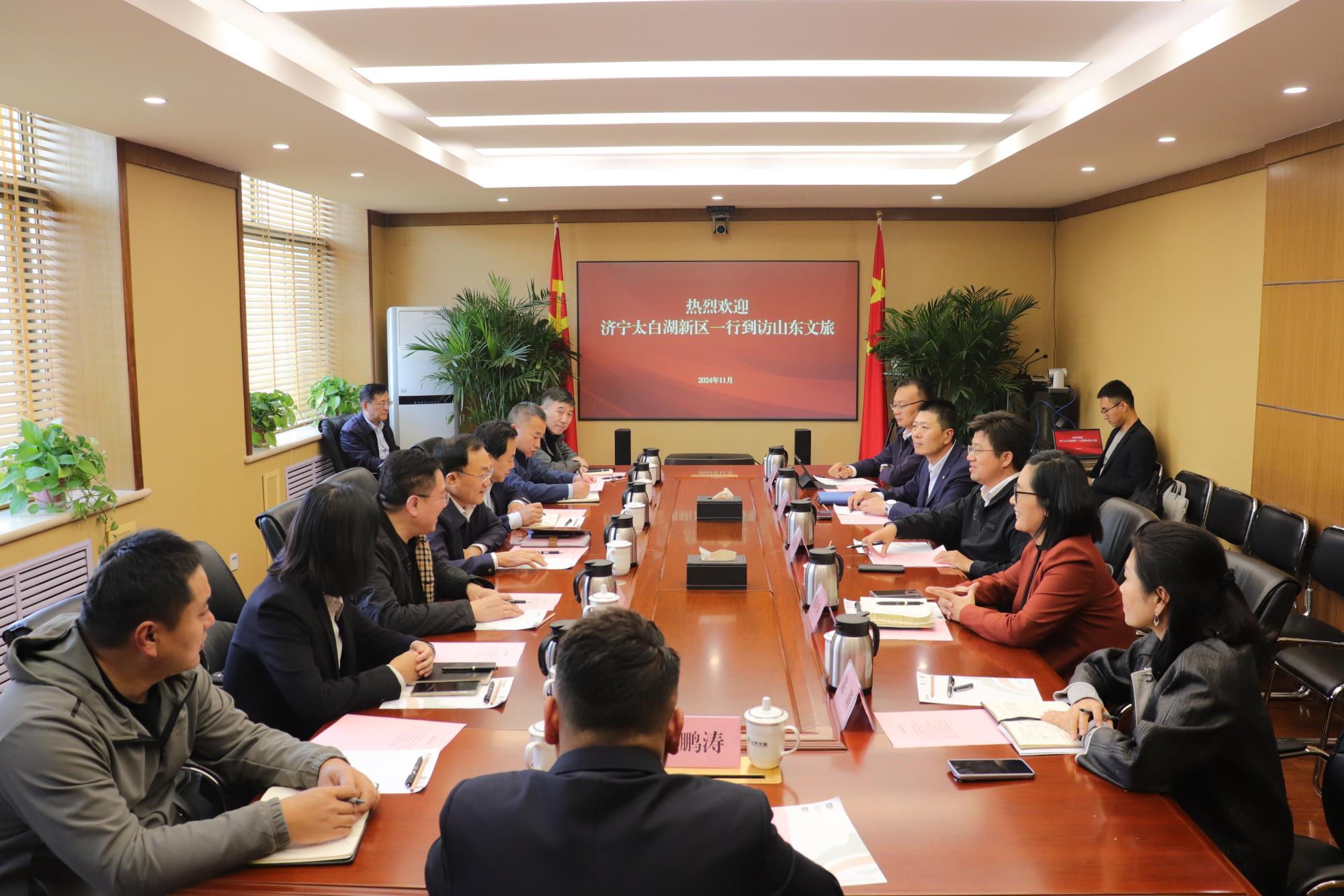 11月19日,山東財金投資集團副總經理張宏亮、濟寧太白湖新區黨工委委員陳志剛一行到訪山東文旅集團,集團黨委副書記、董事、總經理門家春會見。