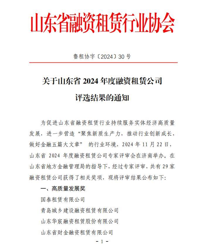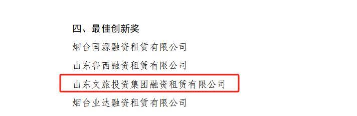 近日,山東省融資租賃行業協會舉辦了2024年全省融資租賃行業有關獎項評選活動。在省地方金融管理局的指導下,經過專家評審,山東文旅投資集團融資租賃有限公司(以下簡稱“文旅租賃”)獲評“最佳創新獎”,成為全省四家獲此殊榮的公司之一。