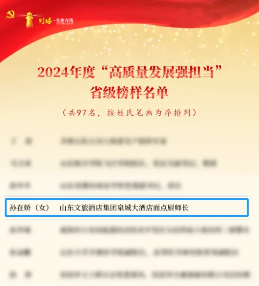 12月6日,山東省委組織部公布2024年度“高質量發展強擔當”省級榜樣名單,山東文旅酒店集團泉城大酒店面點廚師長孫在嬌榮登榜單,作為省國資委推薦的4名榜樣之一成功上榜。