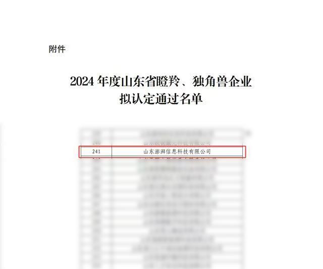 近日,山東省工業(yè)和信息化廳發(fā)布《關(guān)于2024年度山東省瞪羚、獨(dú)角獸企業(yè)擬認(rèn)定通過(guò)名單的公示》,山東文旅集團(tuán)科技發(fā)展有限公司權(quán)屬單位山東澎湃信息科技有限公司成功入選該名單。