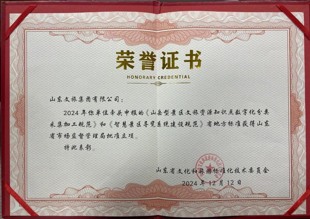 近日,在2024年山東省文化和旅游標準化技術委員會工作年會上,山東文旅集團獲評“2024年度優秀單位”。由集團牽頭申報的兩項省地方標準獲得山東省市場監督管理局批準立項,山東省文化和旅游標準化技術委員會特此進行表彰。