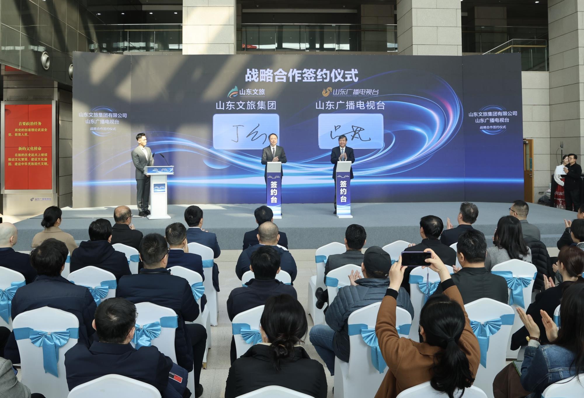 2月25日,山東文旅集團與山東廣播電視臺戰略合作簽約儀式在濟南舉行。山東廣播電視臺黨委書記、臺長呂芃,山東文旅集團黨委書記、董事長丁藝出席儀式并致辭。